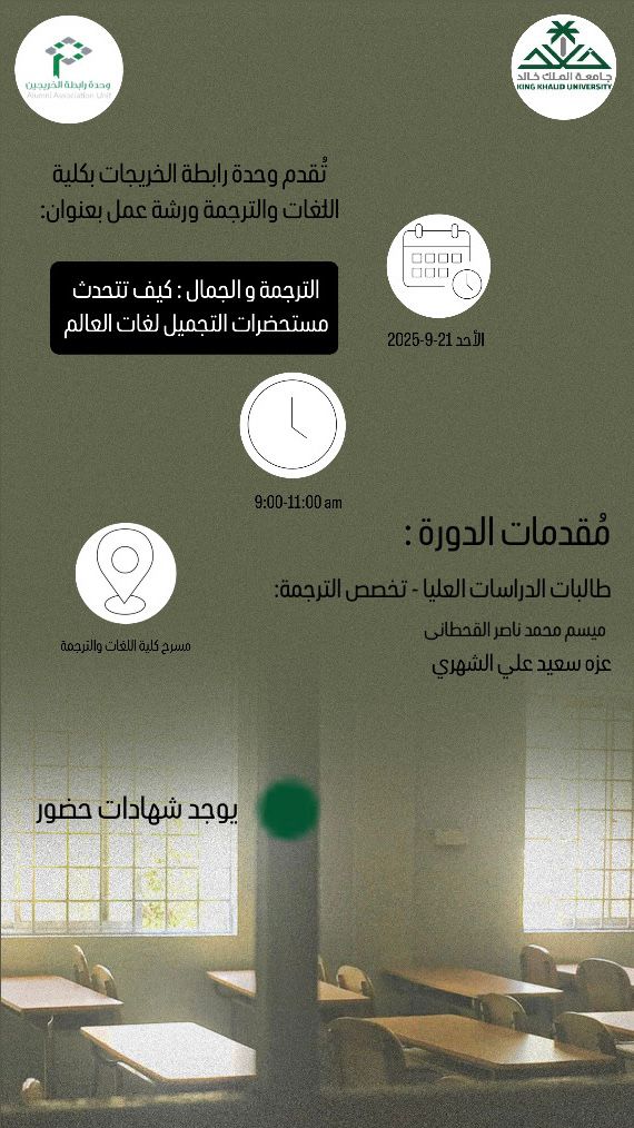 The Alumni Unit at the College of Languages and Translation at Quraiger organized a workshop entitled "Fundamentals of Entrepreneurship." It was delivered by Dr. Amal AbuZaid Mokhtar Ibrahim, Assistant Professor at the College of Business Administration, and Dr. Arefa Abdelrahim Ahmed Dawood, Assistant Professor in the Department of Human Resources Management at King Khalid University.
