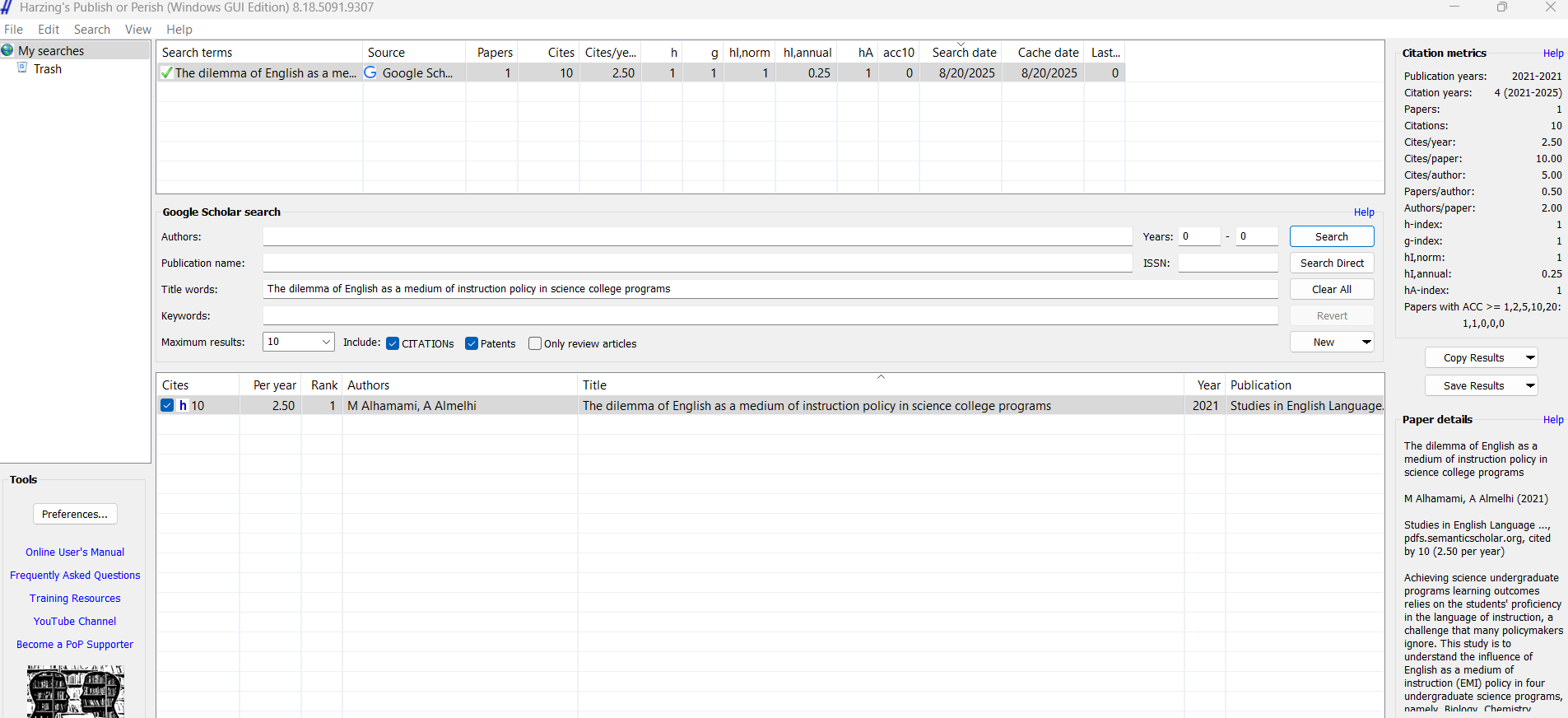 - Alhamami, M., & Almelhi, A. (2021). The dilemma of English as a medium of instruction policy in science college programs. Studies in English Language and Education, 8(3), 1045-1060. https://doi.org/10.24815/siele.v8i3.21218. Click here for this paper's citation report (8/20/2025) - 2024-2025 academic year / 1446 Hijri. Please click here for a summary of the paper.