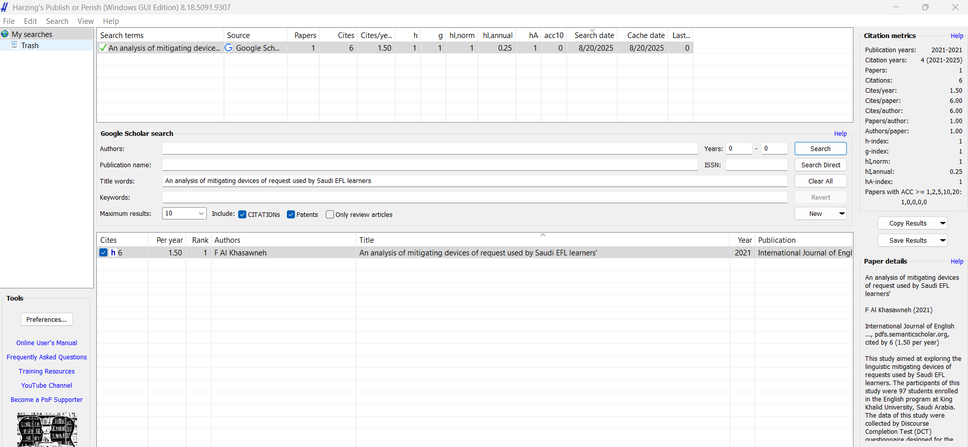 - Al-Khasawneh, F. (2021). An analysis of mitigating devices of request used by Saudi EFL learners. International Journal of English Language Studies, 3(11), 57-64. Click here for this paper's citation report (8/20/2025) - 2024-2025 academic year / 1446 Hijri. Please click here for a summary of the paper.
