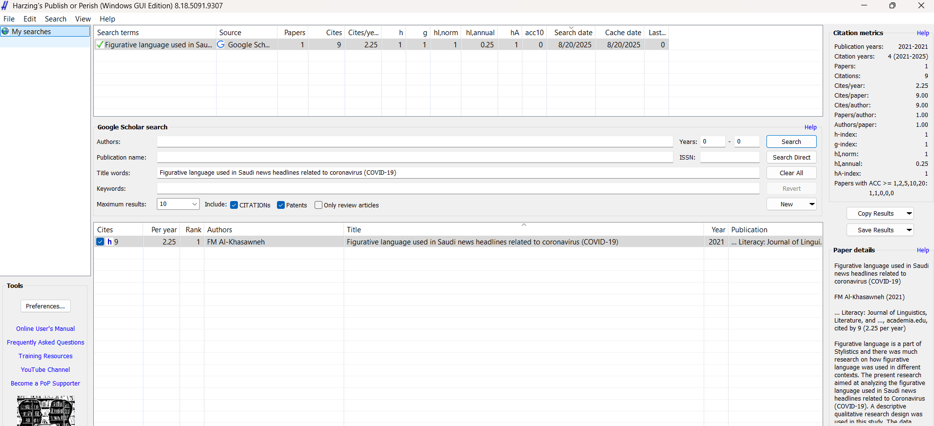 - Al-Khasawneh, F. (2021). Figurative language used in Saudi news headlines related to coronavirus (COVID-19). Language Literacy: Journal of Linguistics, Literature and Language Teaching, 5(2), 265-276. Click here for this paper's citation report (8/20/2025) - 2024-2025 academic year / 1446 Hijri. Please click here for a summary of the paper.