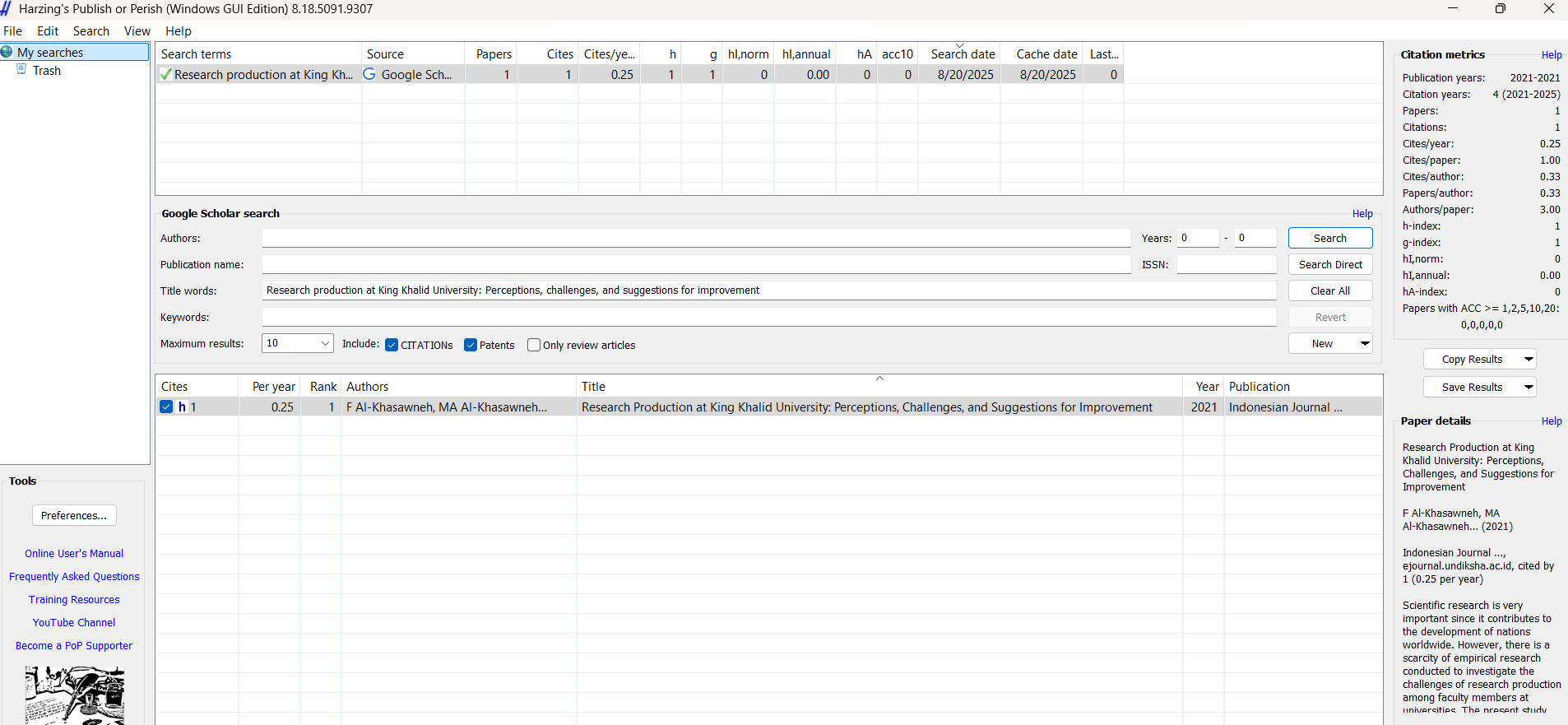 - Al-Khasawneh, F., Al-Khasawneh, M., & Al-Khawaldeh, M. (2021). Research production at King Khalid University: Perceptions, challenges, and suggestions for improvement. Indonesian Journal of Educational Research and Review, 5(1), 91-98. Click here for this paper's citation report (8/20/2025) - 2024-2025 academic year / 1446 Hijri. Please click here for a summary of the paper.