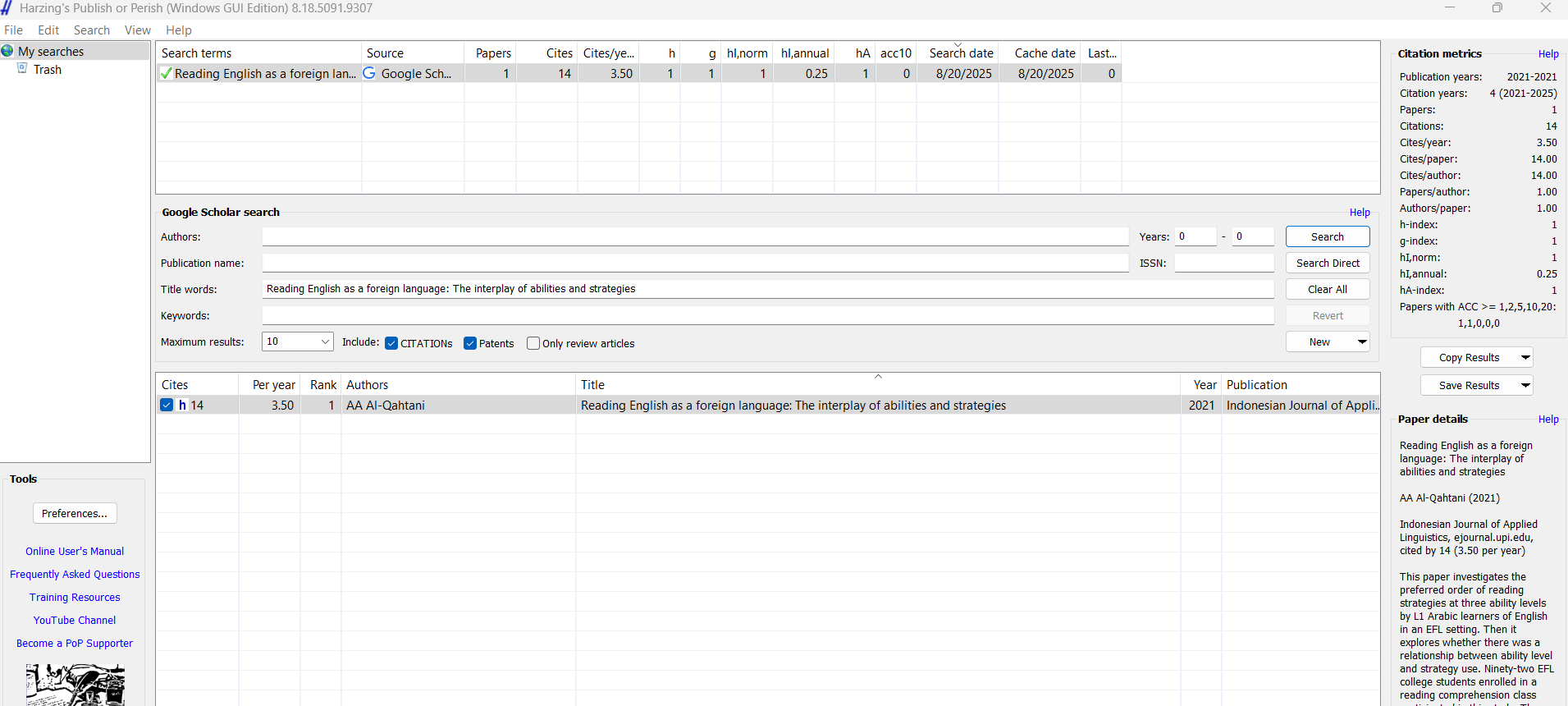 - Al-Qahtani, A. A. (2021). Reading English as a foreign language: The interplay of abilities and strategies. Indonesian Journal of Applied Linguistics, 10(3), 580-589. https://doi.org/10.17509/ijal.v10i3.31738. Click here for this paper's citation report (8/20/2025) - 2024-2025 academic year / 1446 Hijri. Please click here for a summary of the paper.