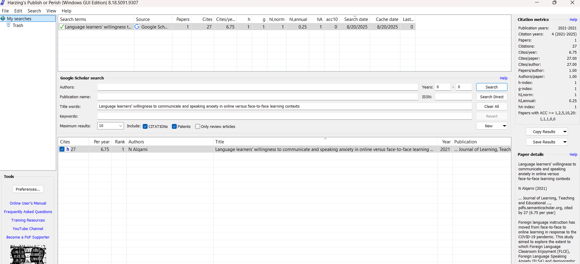 - Alqarni, N. A. (2021). Language learners’ willingness to communicate and speaking anxiety in online versus face-to-face learning contexts. International Journal of Learning, Teaching and Educational Research, 20(11), 57-77. https://doi.org/10.26803/ijlter.20.11.4. Click here for this paper's citation report (8/20/2025) - 2024-2025 academic year / 1446 Hijri. Please click here for a summary of the paper.