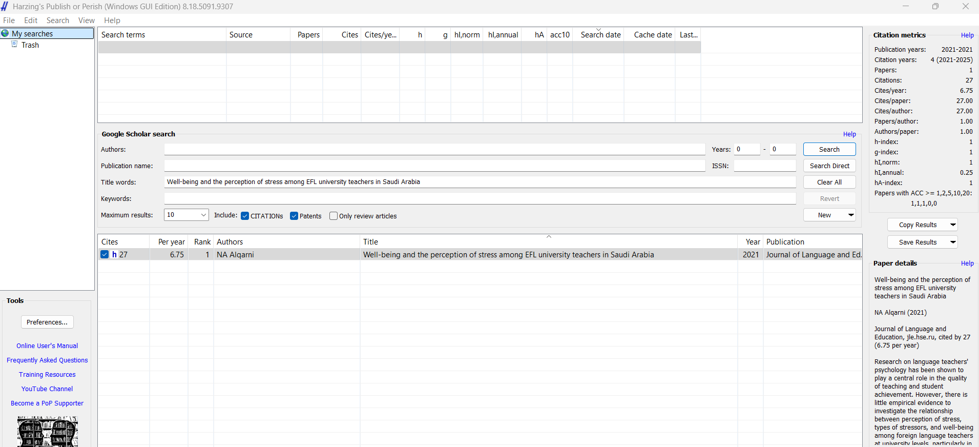 - Alqarni, N. A. (2021). Well-being and the perception of stress among EFL university teachers in Saudi Arabia. Journal of Language and Education, 7(3), 8-22. https://doi.org/10.17323/jle.2021.11494. Click here for this paper's citation report (8/20/2025) - 2024-2025 academic year / 1446 Hijri. Please click here for a summary of the paper.