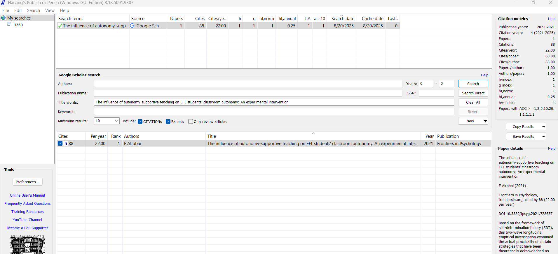 - Alrabai, F. (2021). The influence of autonomy-supportive teaching on EFL students' classroom autonomy: An experimental intervention. Frontiers in Psychology, 3748. https://doi.org/10.3389/fpsyg.2021.728657. Click here for this paper's citation report (8/20/2025) - 2024-2025 academic year / 1446 Hijri. Please click here for a summary of the paper.