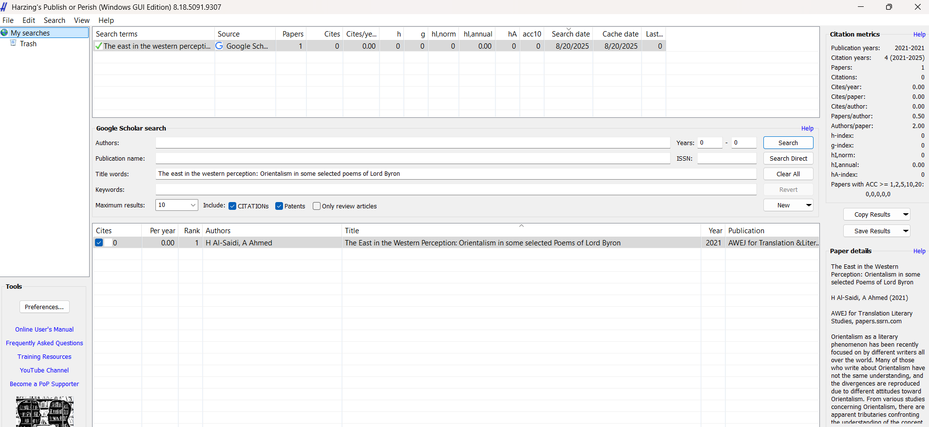 - Al-Saidi, A. A. H. (2021). The east in the western perception: Orientalism in some selected poems of Lord Byron. AWEJ for Translation & Literary Studies, 5(3), 17-26. https://doi.org/10.24093/awejtls/vol5no3.2. Click here for this paper's citation report (8/20/2025) - 2024-2025 academic year / 1446 Hijri. Please click here for a summary of the paper.