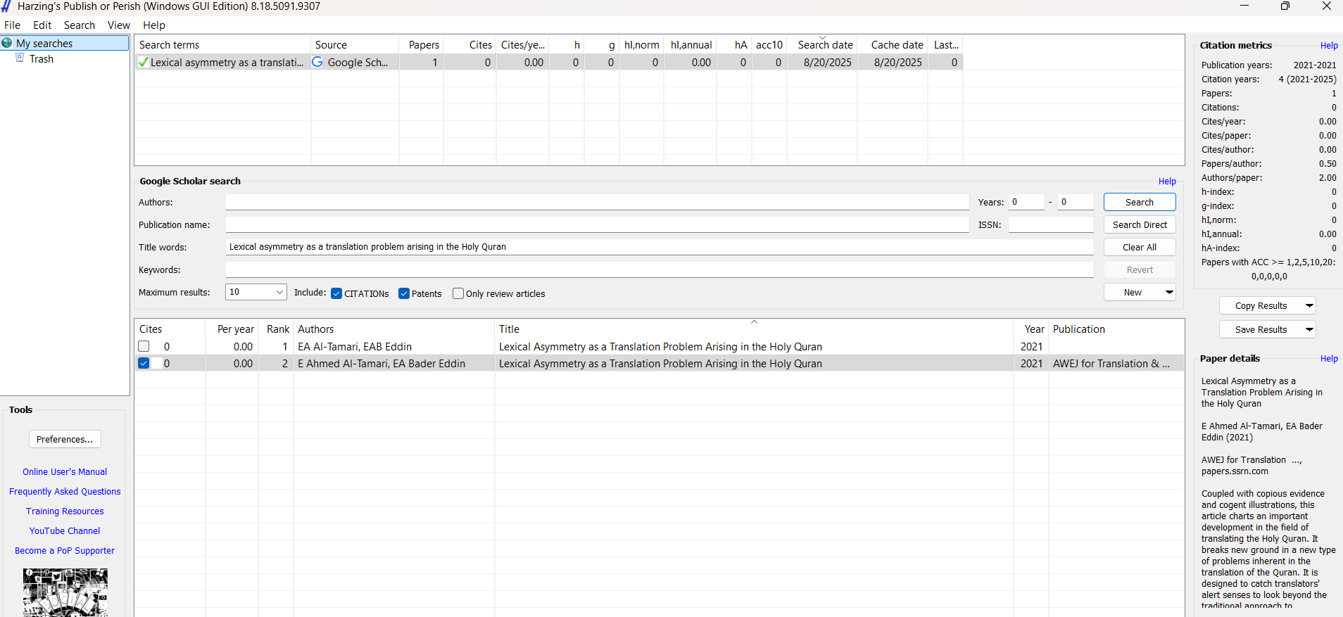 - Al-Tamari, E. A., & Bader Eddin, E. A. (2021). Lexical asymmetry as a translation problem arising in the Holy Quran. Arab World English Journal for Translation & Literary Studies, 5(2), 2-17. Click here for this paper's citation report (8/20/2025) - 2024-2025 academic year / 1446 Hijri. Please click here for a summary of the paper.