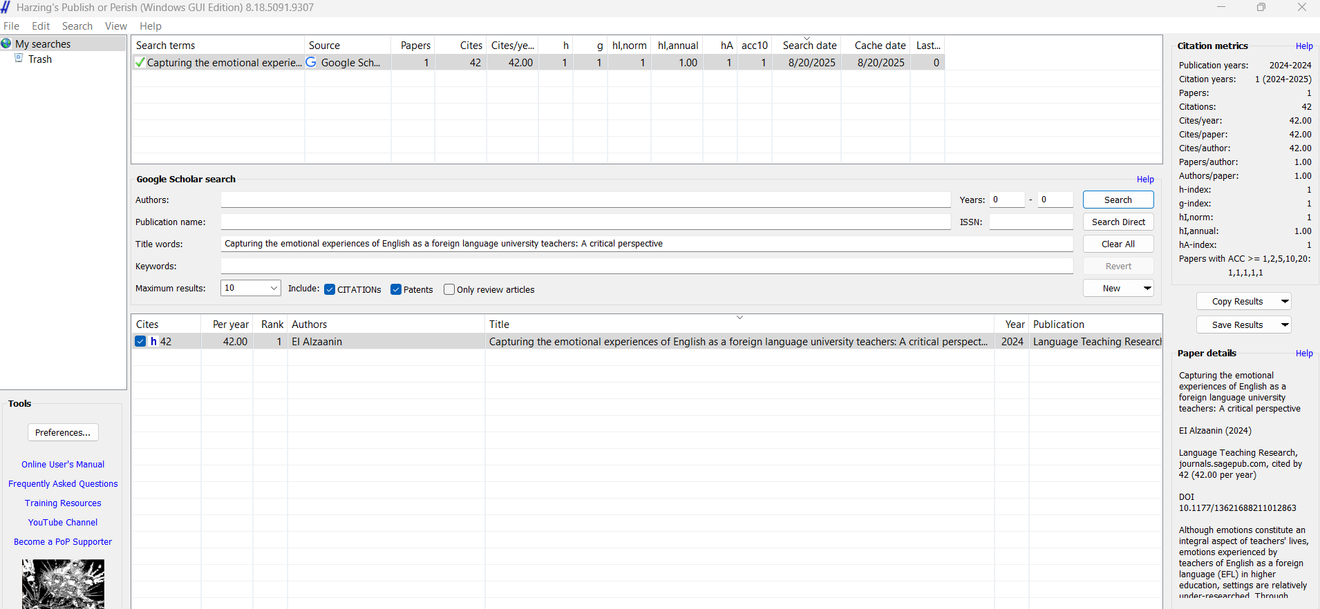 - Alzaanin, E. I. (2021). Capturing the emotional experiences of English as a foreign language university teachers: A critical perspective. SAGE: Language Teaching Research, 1–17. https://doi.org/10.1177/13621688211012863. Click here for this paper's citation report (8/20/2025) - 2024-2025 academic year / 1446 Hijri. Please click here for a summary of the paper.