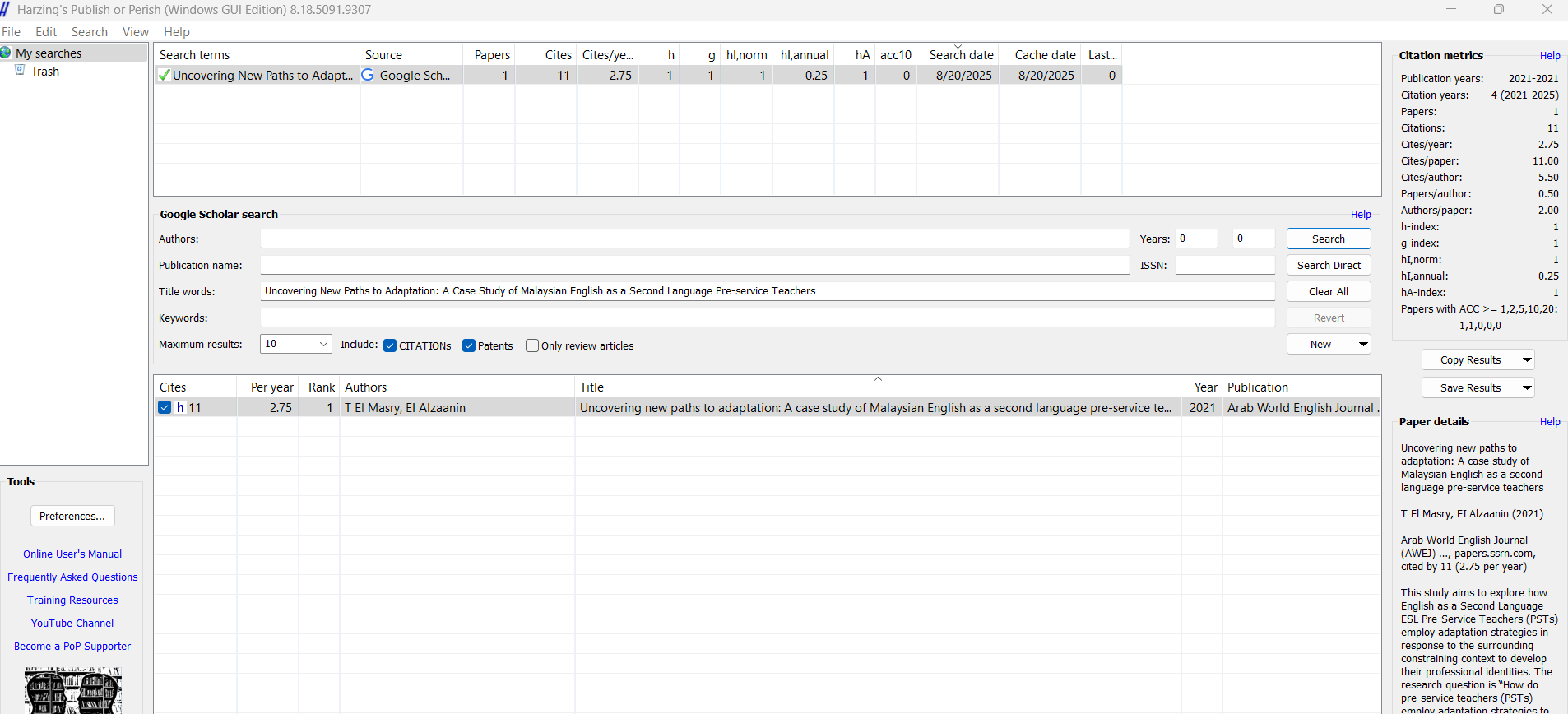 - El Masry, Taghreed and I. Alzaanin, Eman, Uncovering New Paths to Adaptation: A Case Study of Malaysian English as a Second Language Pre-service Teachers (March 15, 2021). Arab World English Journal (AWEJ) Volume 12. Number1 March 2021 , Available at SSRN: https://ssrn.com/abstract=3826857 or https://dx.doi.org/10.2139/ssrn.3826857. Click here for this paper's citation report (8/20/2025) - 2024-2025 academic year / 1446 Hijri. Please click here for a summary of the paper.