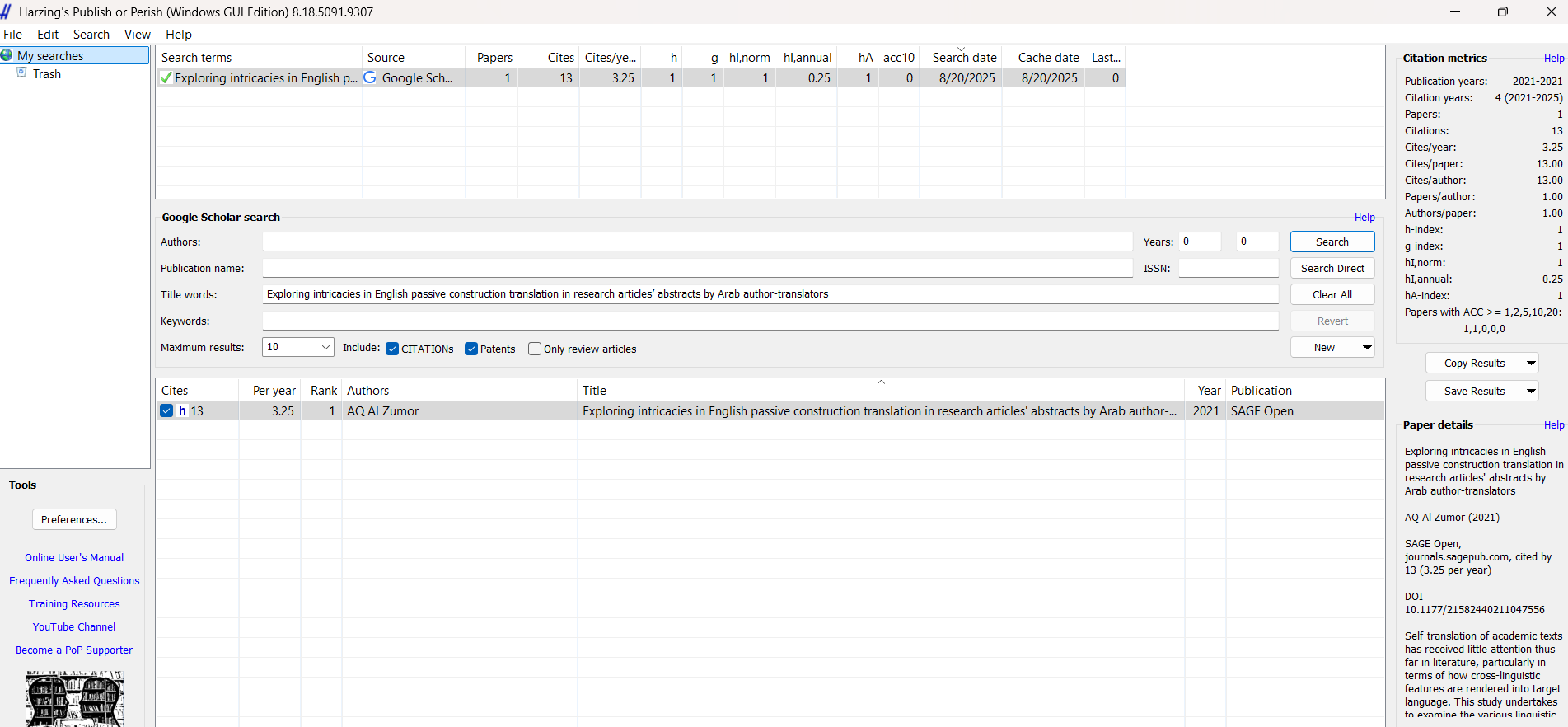 - Al Zumor, A. Q. (2021). Exploring intricacies in English passive construction translation in research articles’ abstracts by Arab author-translators. SAGE Open, 11(3), 21582440211047556. Click here for this paper's citation report (8/20/2025) - 2024-2025 academic year / 1446 Hijri. Please click here for a summary of the paper.