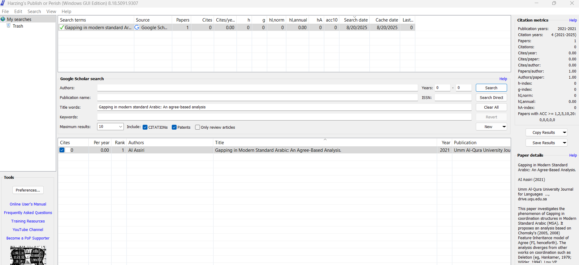 - Assiri, A. (2021). Gapping in modern standard Arabic: An agree-based analysis. Journal of Umm Al-Qura Language Sciences and Literature, 27, 479-513. Click here for this paper's citation report (8/20/2025) - 2024-2025 academic year / 1446 Hijri. Please click here for a summary of the paper.
