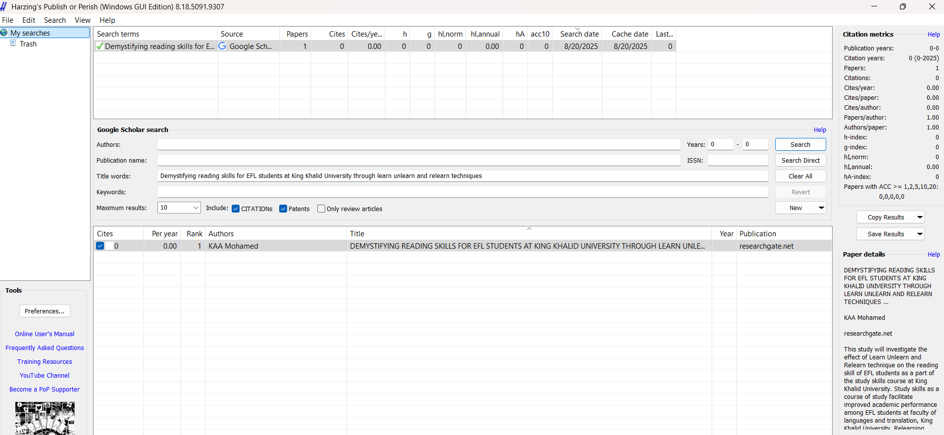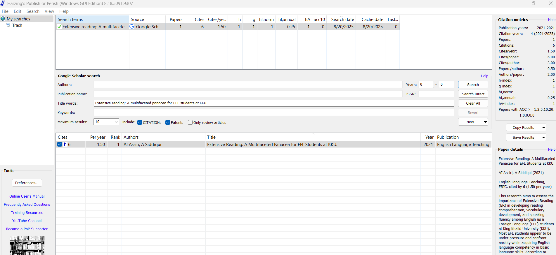 - Assiri, A. I., & Siddiqui, A. (2021). Extensive reading: A multifaceted panacea for EFL students at KKU. English Language Teaching, 14(8), 40-46. https://doi.org/10.5539/elt.v14n8p40. Click here for this paper's citation report (8/20/2025) - 2024-2025 academic year / 1446 Hijri. Please click here for a summary of the paper.