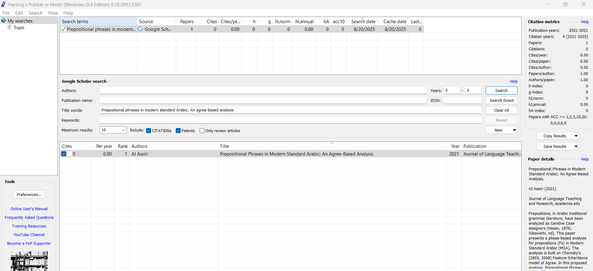 - Assiri, A. (2021). Prepositional phrases in modern standard Arabic: An agree-based analysis. Journal of Language Teaching and Research, 12(6), 884-891. https://doi.org/10.17507/jltr.1206.04. Click here for this paper's citation report (8/20/2025) - 2024-2025 academic year / 1446 Hijri. Please click here for a summary of the paper.