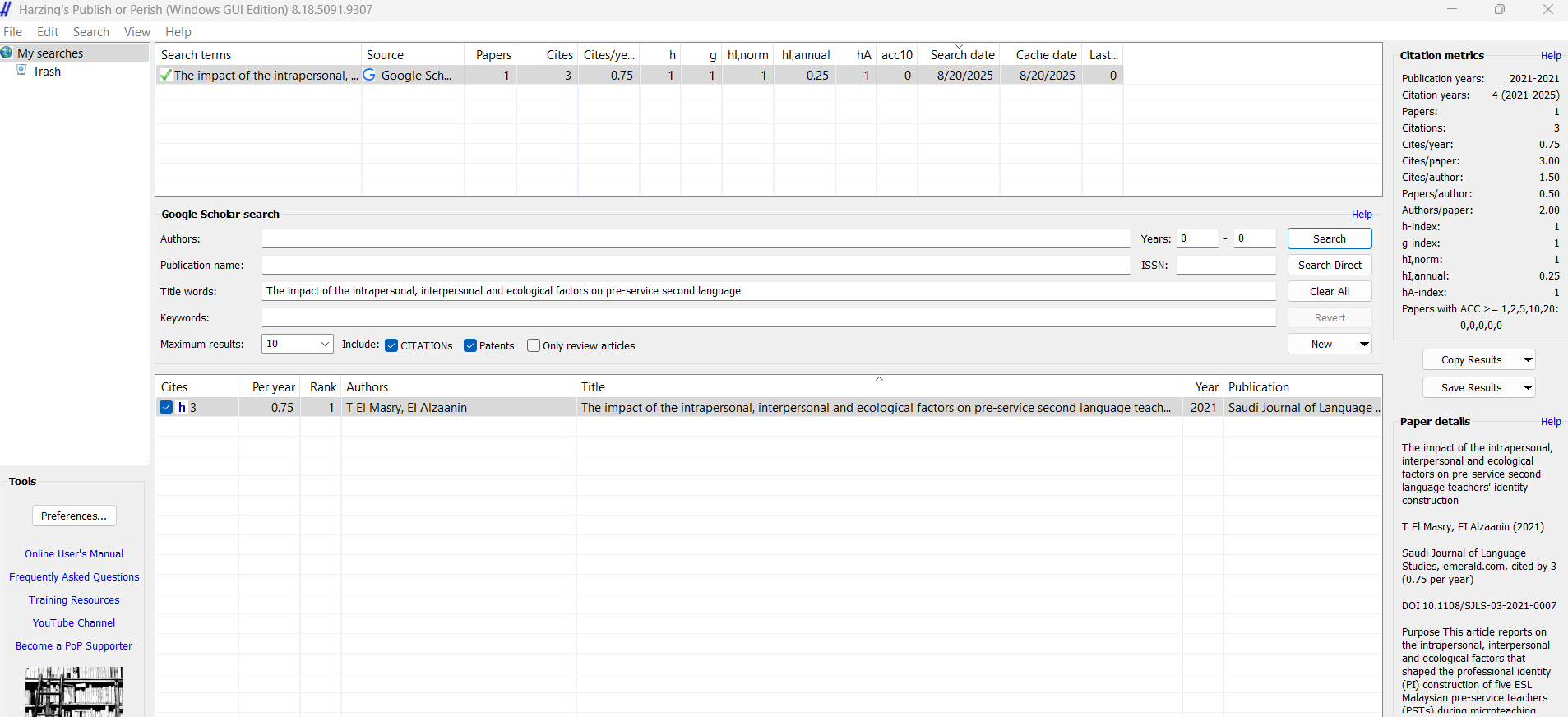- El Masry, T., & Alzaanin, E. I. (2021). The impact of the intrapersonal, interpersonal and ecological factors on pre-service second language teachers' identity construction. Saudi Journal of Language Studies, 1(1), 50-66. Click here for this paper's citation report (8/20/2025) - 2024-2025 academic year / 1446 Hijri. Please click here for a summary of the paper.