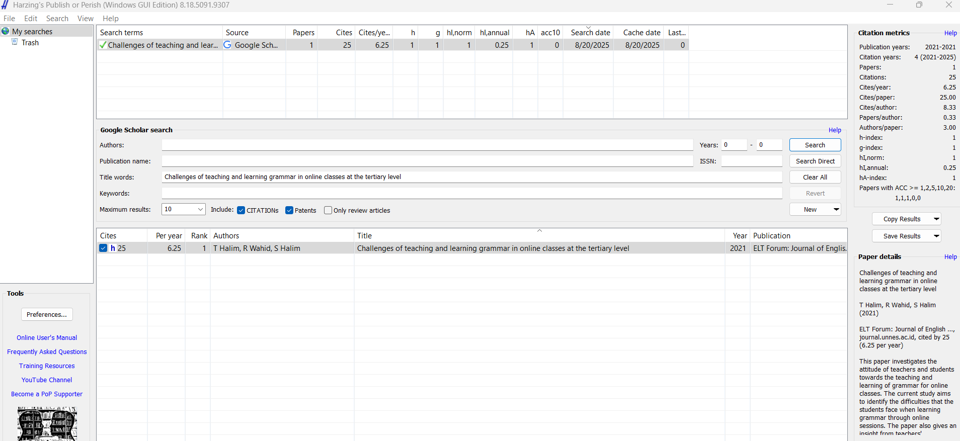 - Halim, T., Wahid, R., & Halim, S. (2021). Challenges of teaching and learning grammar in online classes at the tertiary level. ELT Forum: Journal of English Language Teaching, 10(3), 212-221. https://doi.org/10.15294/elt.v10i3.47970. Click here for this paper's citation report (8/20/2025) - 2024-2025 academic year / 1446 Hijri. Please click here for a summary of the paper.