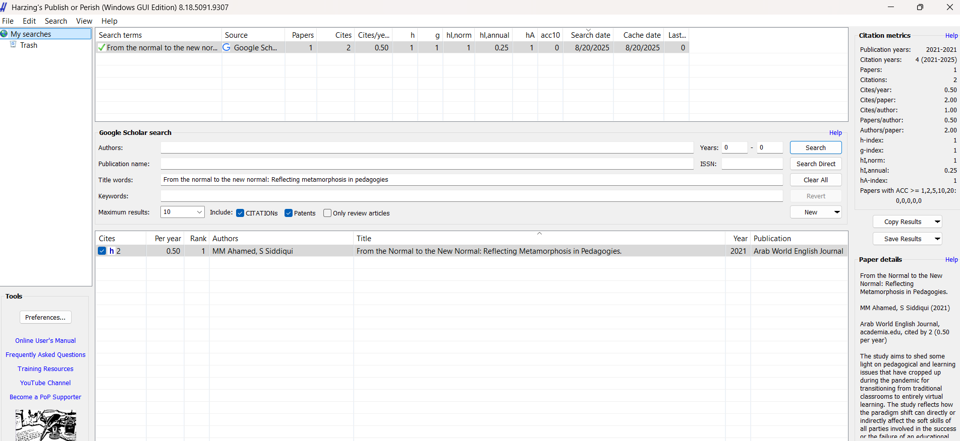 - Ahamed, M.M., & Siddiqui, S. (2021). From the normal to the new normal: Reflecting metamorphosis in pedagogies. Arab World English Journal (AWEJ) Special Issue on CALL, 7, 419-434. https://doi.org/10.24093/awej/call7.29. Click here for this paper's citation report (8/20/2025) - 2024-2025 academic year / 1446 Hijri. Please click here for a summary of the paper.