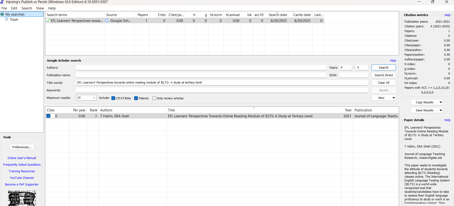- Halim, T., & Shah, S.R.A. (2021). EFL Learners' Perspectives towards online reading module of IELTS: A study at tertiary level. Journal of Language Teaching Research, 12(6), 942-947. https://doi.org/10.17507/jltr.1206.10. Click here for this paper's citation report (8/20/2025) - 2024-2025 academic year / 1446 Hijri. Please click here for a summary of the paper.
