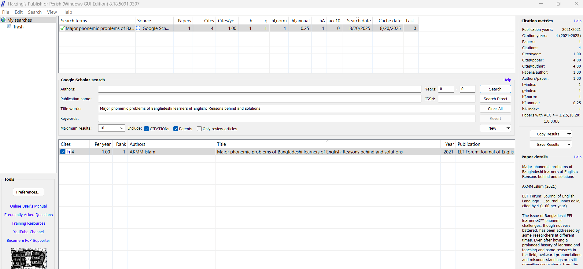 - Islam, A. K. M. Mazharul. (2021). Major phonemic problems of Bangladeshi learners of English: Reasons behind and solutions. ELT Forum Journal of English Language Teaching, 10(1), 30-39. https://doi.org/10.15294/elt.v10i1.45061. Click here for this paper's citation report (8/20/2025) - 2024-2025 academic year / 1446 Hijri. Please click here for a summary of the paper.