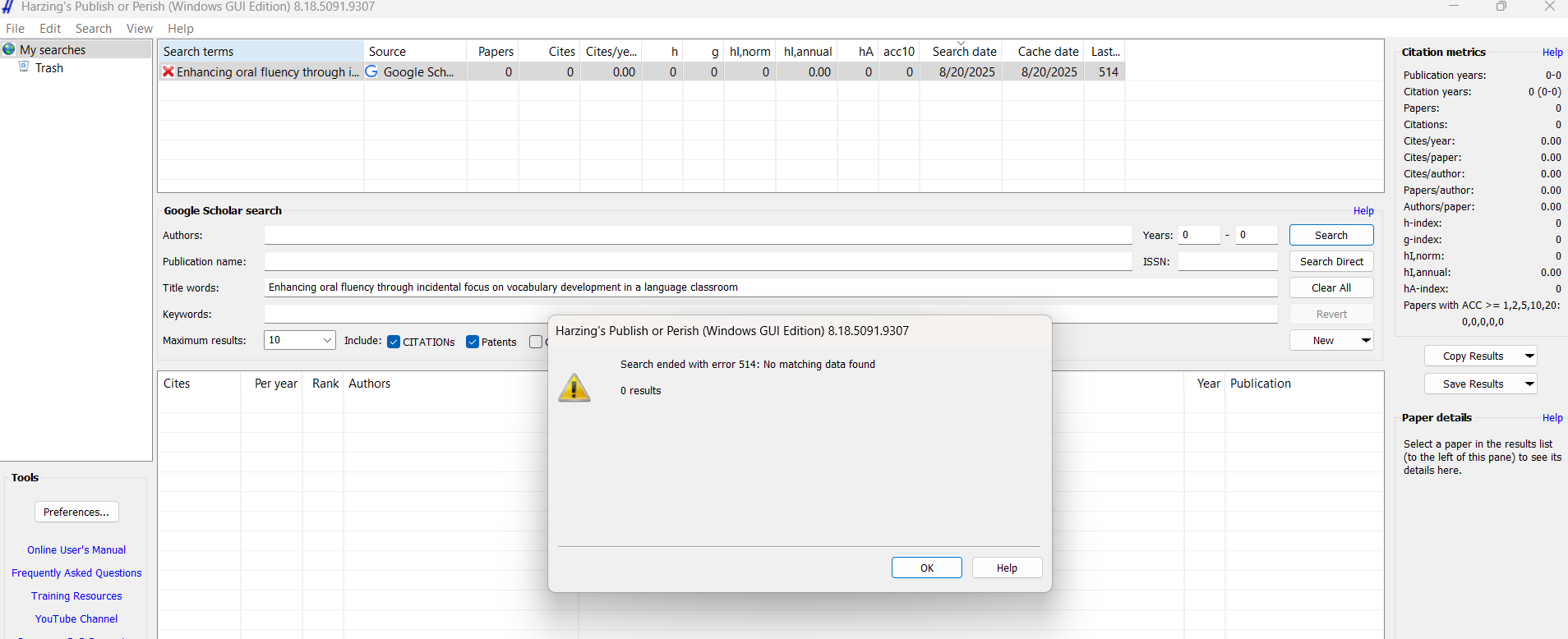 - Kana’an, B. et al. (2021). Enhancing oral fluency through incidental focus on vocabulary development in a language classroom. Journal of Tianjin University Science and Technology, 54(12), 703-721. https://doi.org/10.17605/OSF.IO/KUXZJ. Click here for this paper's citation report (8/20/2025) - 2024-2025 academic year / 1446 Hijri. Please click here for a summary of the paper.