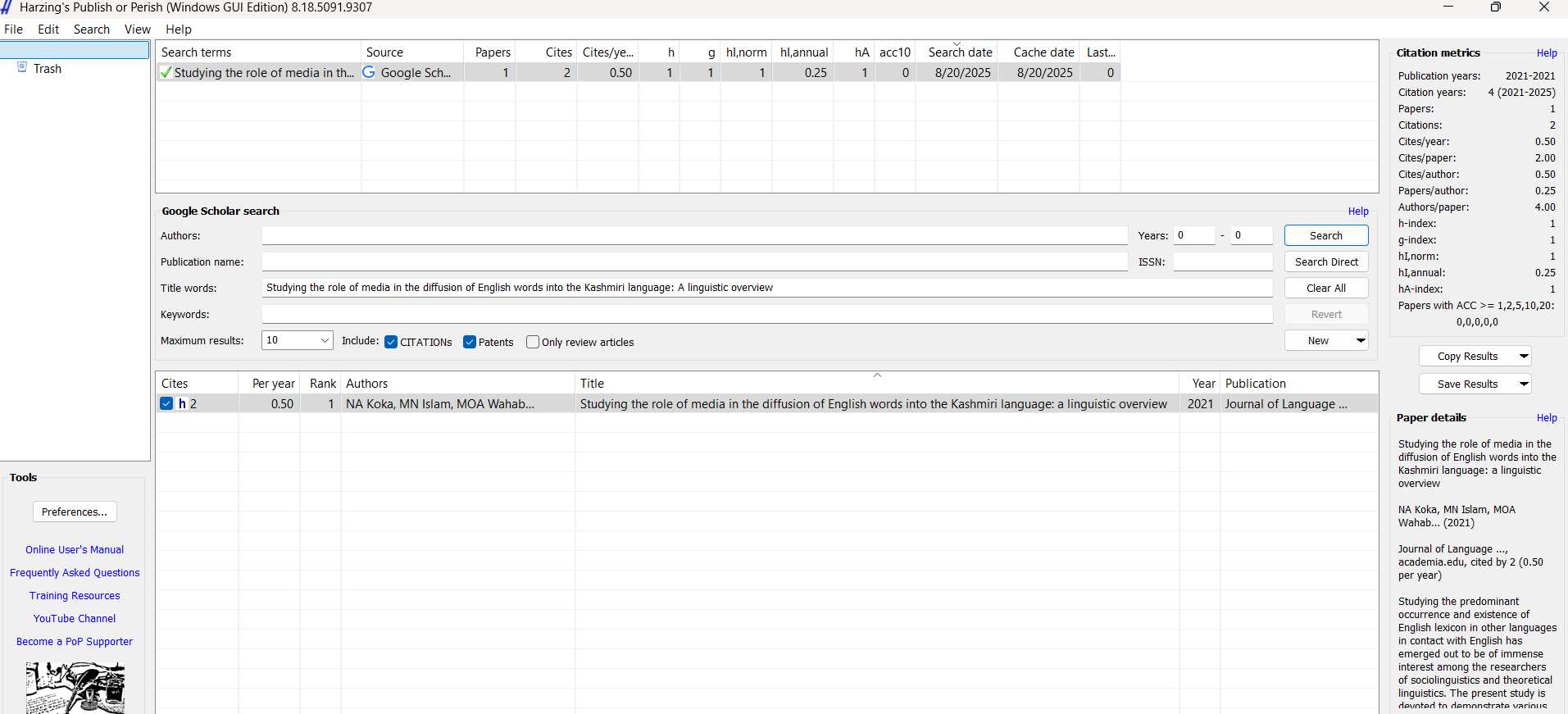 - Koka, N. A., Islam, M. N., Wahab, M. O. A., & Ahmad, J. (2021). Studying the role of media in the diffusion of English words into the Kashmiri language: A linguistic overview. Journal of Language Teaching and Research, 12(6), 1056-1069. https://doi.org/10.17507/jltr.1204.22. Click here for this paper's citation report (8/20/2025) - 2024-2025 academic year / 1446 Hijri. Please click here for a summary of the paper.