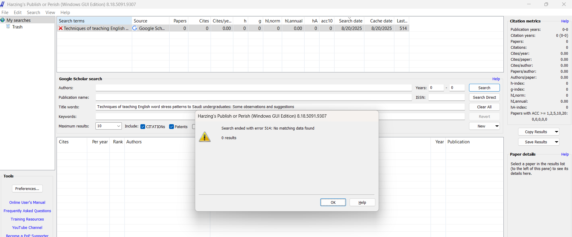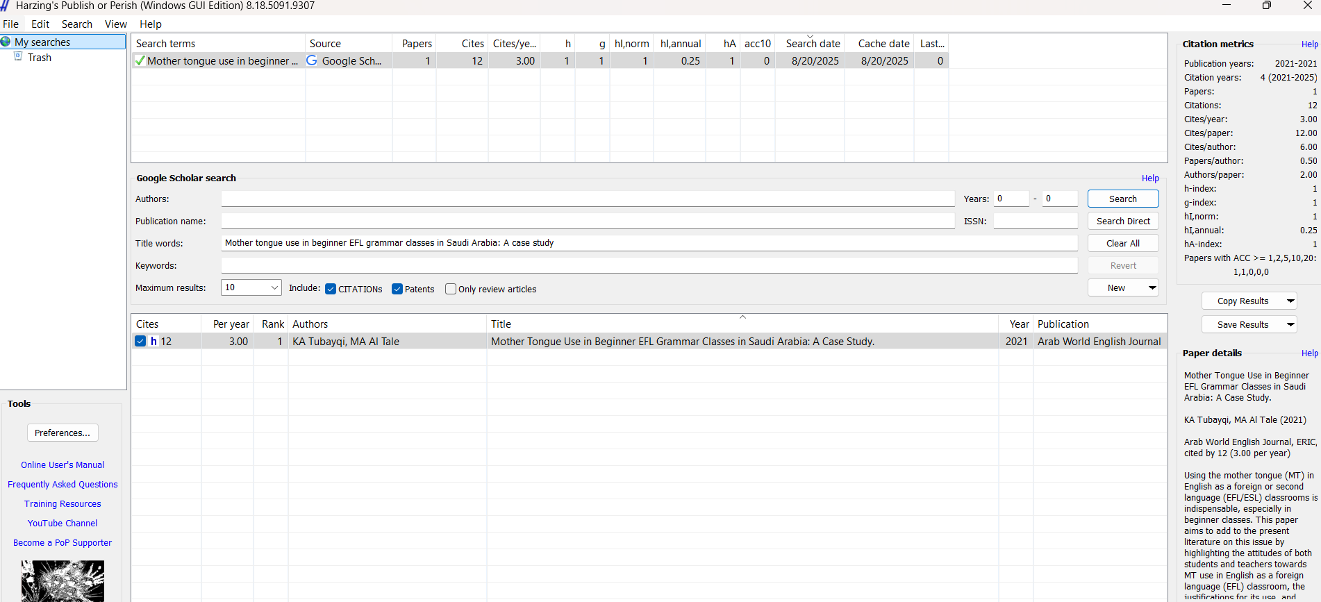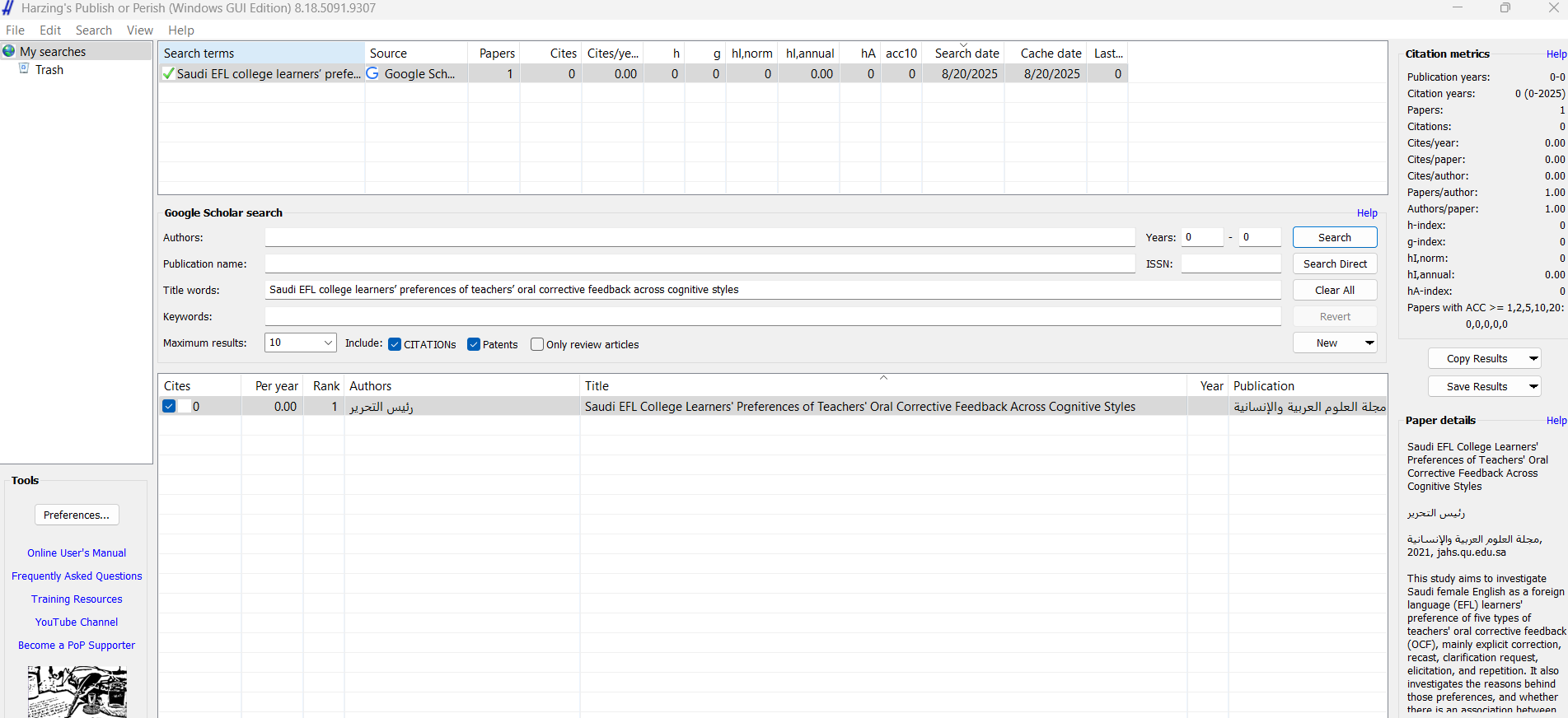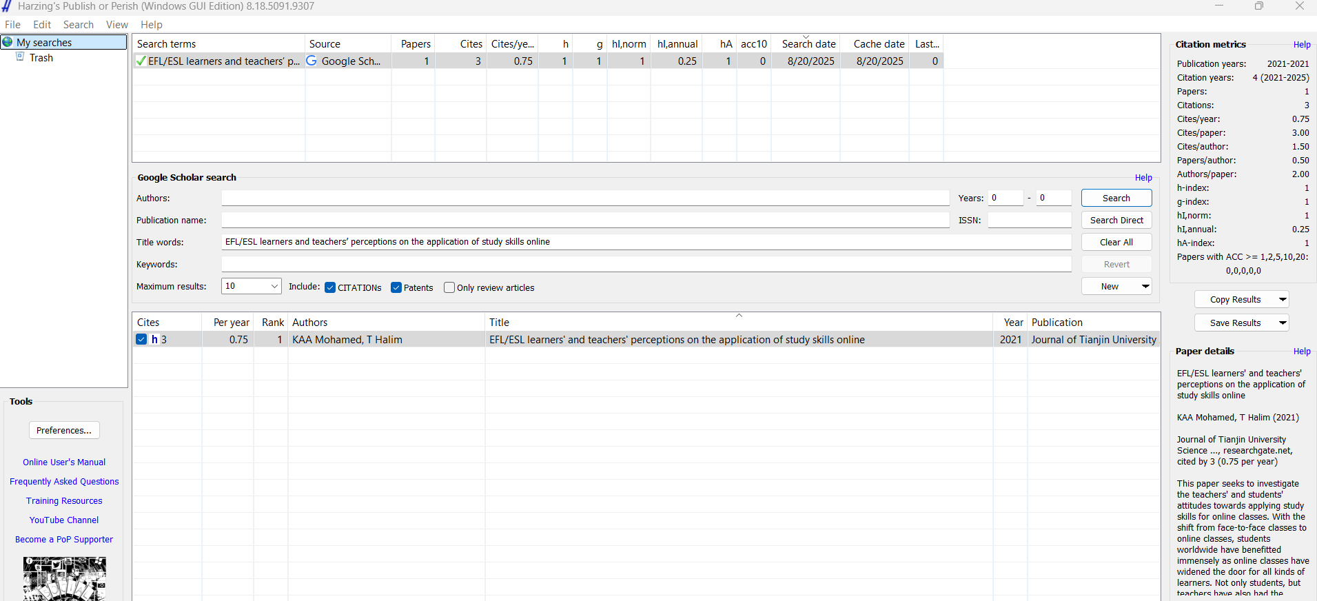 - Mohammed, K. & Halim, T. (2021). EFL/ESL learners and teachers’ perceptions on the application of study skills online. Journal of Tianjin University Science and Technology, 54(9). https://doi.org/10.17605/OSF.IO/DHVG6. Click here for this paper's citation report (8/20/2025) - 2024-2025 academic year / 1446 Hijri. Please click here for a summary of the paper.