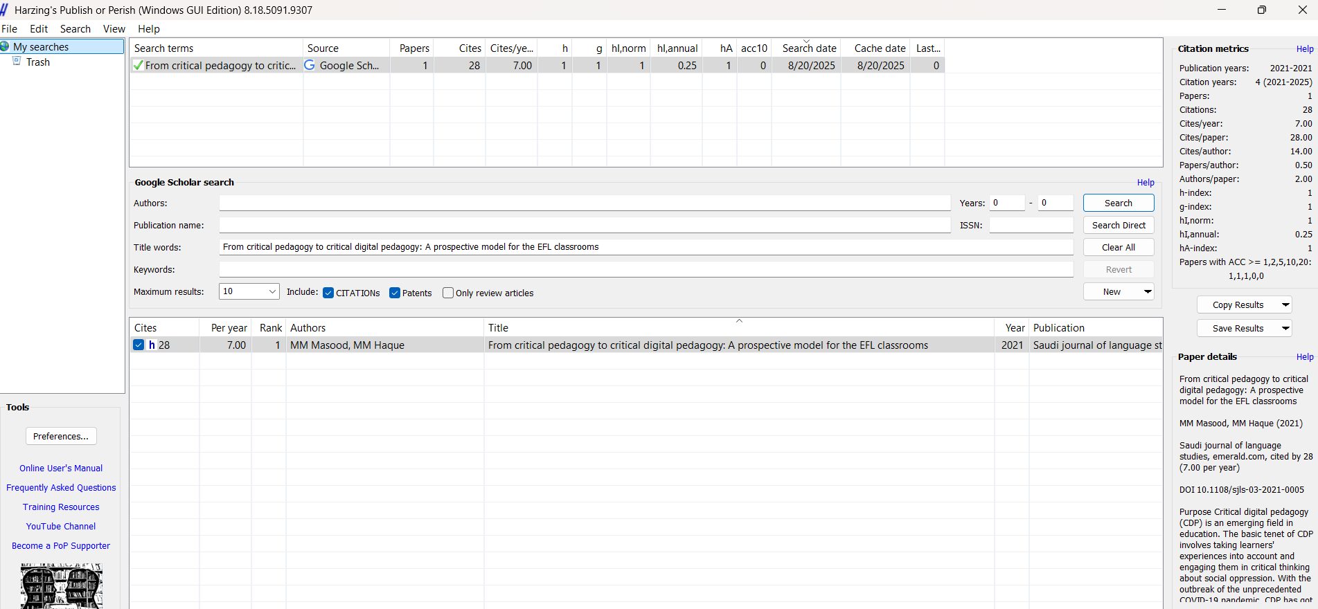 - Masood, M.M. & Haque, M.M. (2021). From critical pedagogy to critical digital pedagogy: A prospective model for the EFL classrooms. Saudi Journal of Language Studies, 1(1), 67-80. https://doi.org/10.1108/SJLS-03-2021-0005. Click here for this paper's citation report (8/20/2025) - 2024-2025 academic year / 1446 Hijri. Please click here for a summary of the paper.