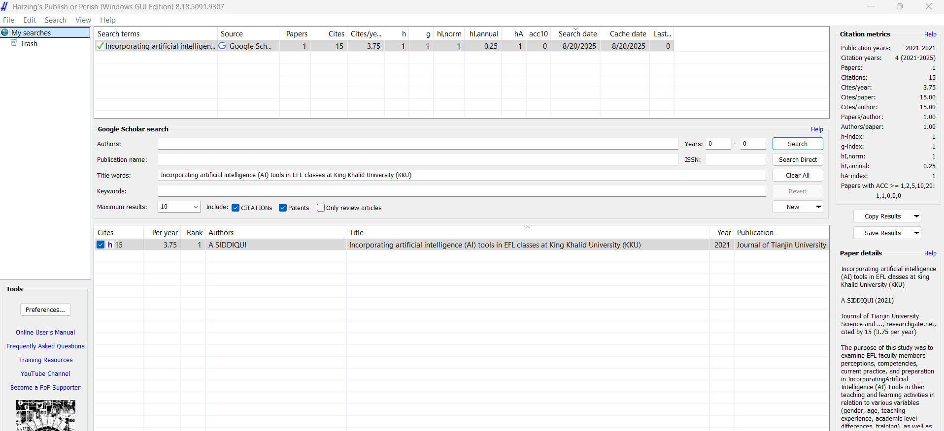 - Mohammed, K., & Siddique, A. (2021). Incorporating artificial intelligence (AI) tools in EFL classes at King Khalid University (KKU). Journal of Tianjin University Science and Technology, 54(10). https://doi.org/10.17605/OSF.IO/N7QSF. Click here for this paper's citation report (8/20/2025) - 2024-2025 academic year / 1446 Hijri. Please click here for a summary of the paper.
