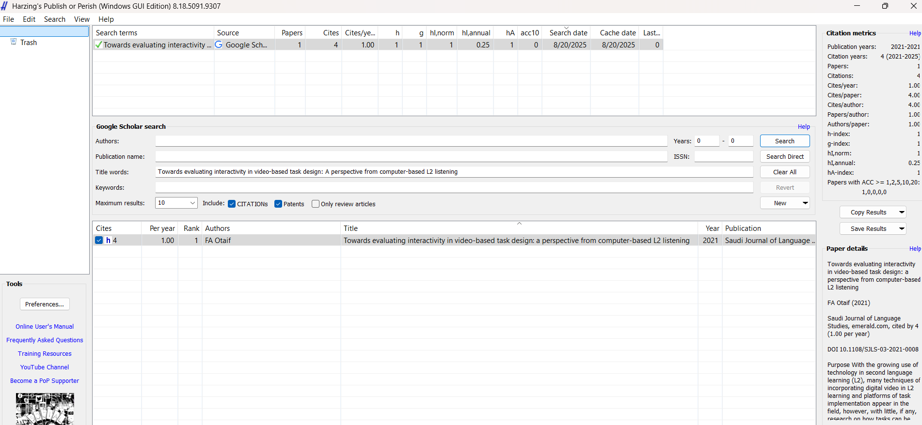 - Otaif, F. (2021). Towards evaluating interactivity in video-based task design: A perspective from computer-based L2 listening. Saudi Journal of Language Studies. 1(1). Click here for this paper's citation report (8/20/2025) - 2024-2025 academic year / 1446 Hijri. Please click here for a summary of the paper.