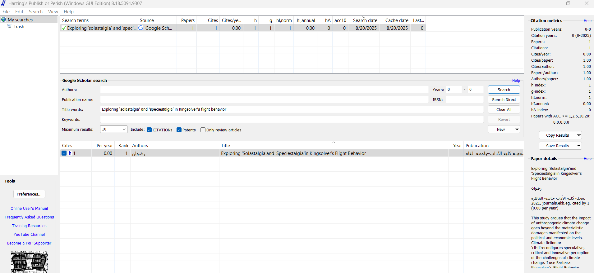 - Radwan, M. (2021). Exploring ‘solastalgia’ and ‘speciestalgia’ in Kingsolver’s flight behavior. Bulletin of the Faculty of Arts, Cairo University, 81(2), 105-138. https://doi.org/10.21608/jarts.2021.67634.1114. Click here for this paper's citation report (8/20/2025) - 2024-2025 academic year / 1446 Hijri. Please click here for a summary of the paper.