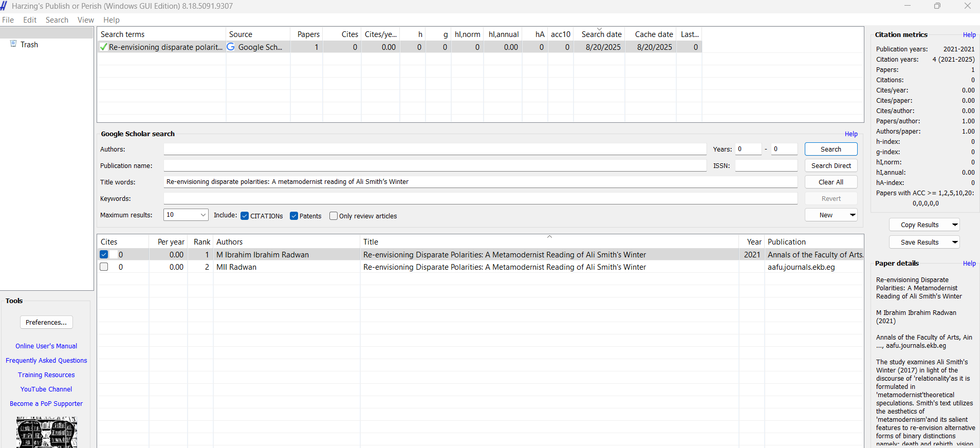 - Radwan, M. (2021). Re-envisioning disparate polarities: A metamodernist reading of Ali Smith’s Winter. Annals of the Faculty of Arts, Ain Shams University, 49(4). Click here for this paper's citation report (8/20/2025) - 2024-2025 academic year / 1446 Hijri. Please click here for a summary of the paper.