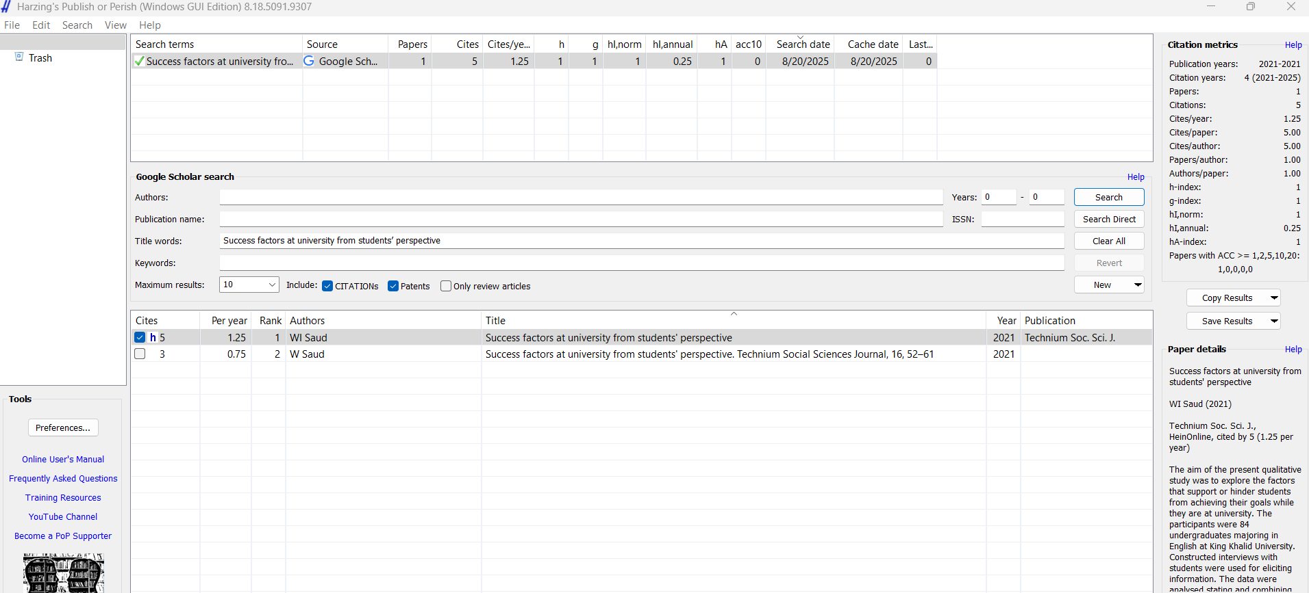 - Saud, W. I. (2021). Success factors at university from students’ perspective. Technium Social Sciences Journal, 16(1), 52–61. https://doi.org/10.47577/tssj.v16i1.2359. Click here for this paper's citation report (8/20/2025) - 2024-2025 academic year / 1446 Hijri. Please click here for a summary of the paper.