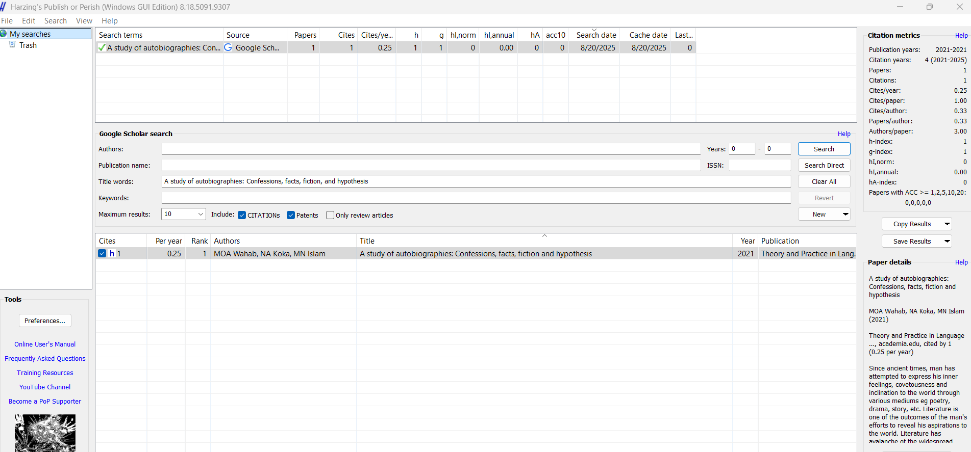 - Wahab, M. O. A., Koka, N. A., & Islam, M. N. (2021). A study of autobiographies: Confessions, facts, fiction, and hypothesis. Theory and Practice in Language Studies, 11(4), 457-461. Click here for this paper's citation report (8/20/2025) - 2024-2025 academic year / 1446 Hijri. Please click here for a summary of the paper.