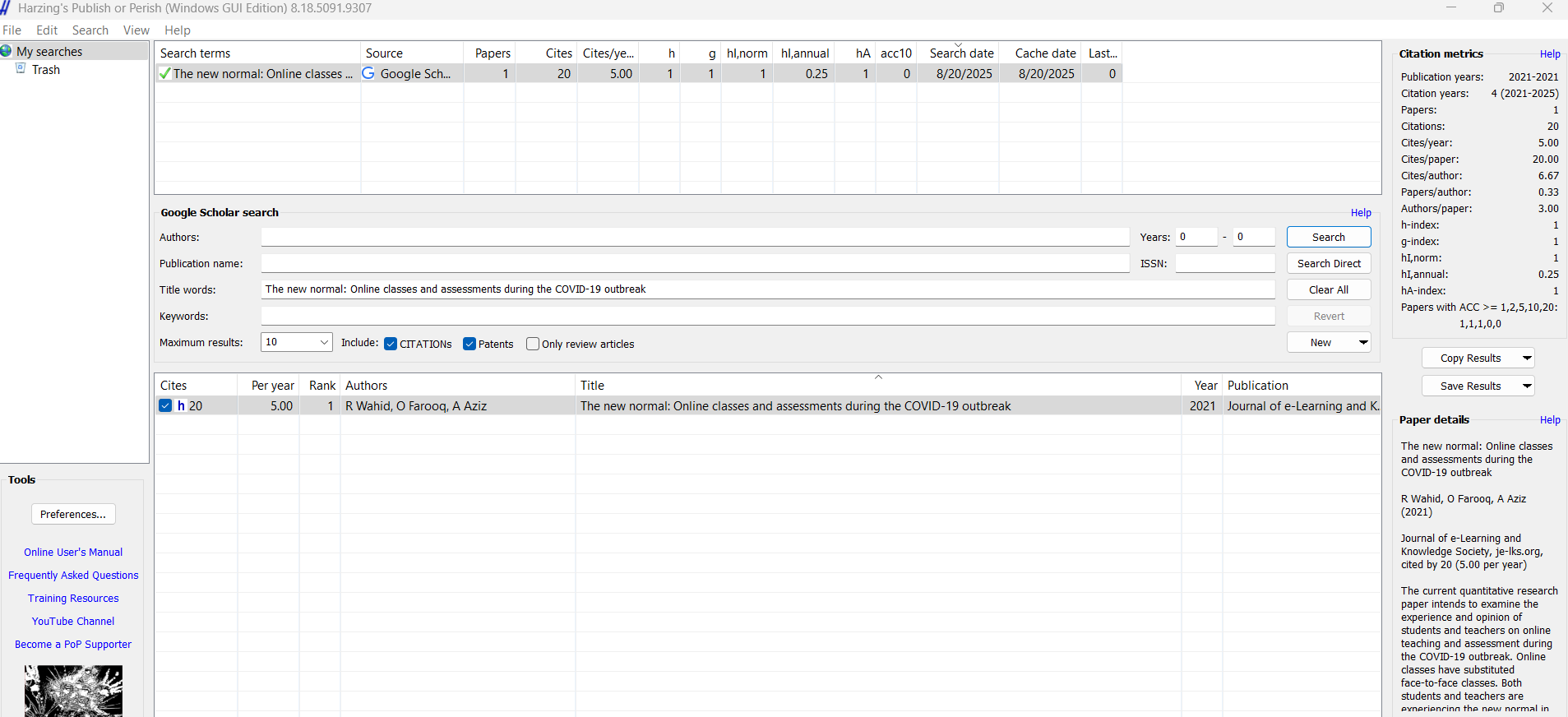 - Wahid, R., Farooq, O., & Aziz, A. (2021). The new normal: Online classes and assessments during the COVID-19 outbreak. Journal of e-Learning and Knowledge Society, 17(2), 85-96. https://doi.org/10.20368/1971-8829/1135346. Click here for this paper's citation report (8/20/2025) - 2024-2025 academic year / 1446 Hijri. Please click here for a summary of the paper.