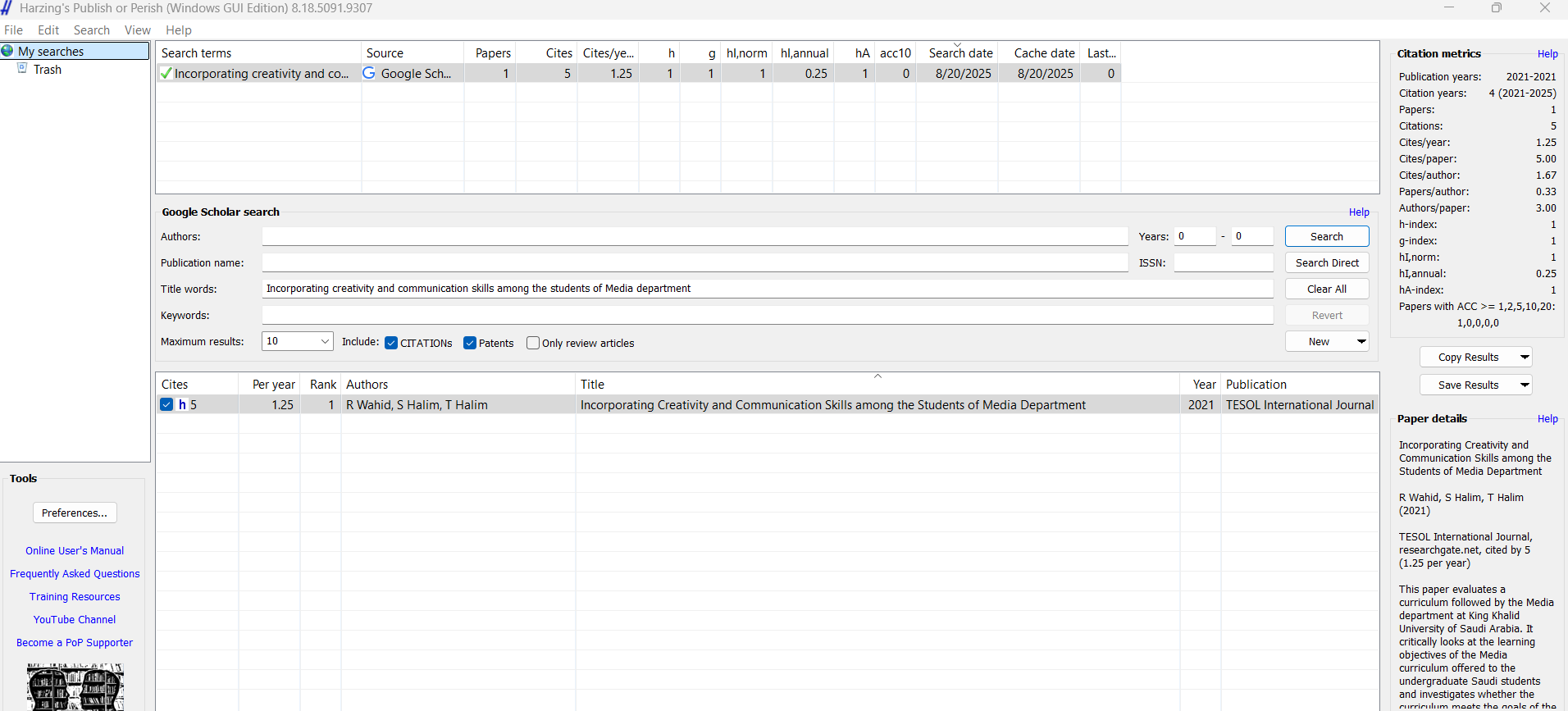 - Wahid, R., Halim, S., & Halim, T. (2021). Incorporating creativity and communication skills among the students of Media department. TESOL International Journal, 16(6.1), 111-123. https://www.tesol-international-journal.com/volume-16-issue-6-1-2021/. Click here for this paper's citation report (8/20/2025) - 2024-2025 academic year / 1446 Hijri. Please click here for a summary of the paper.