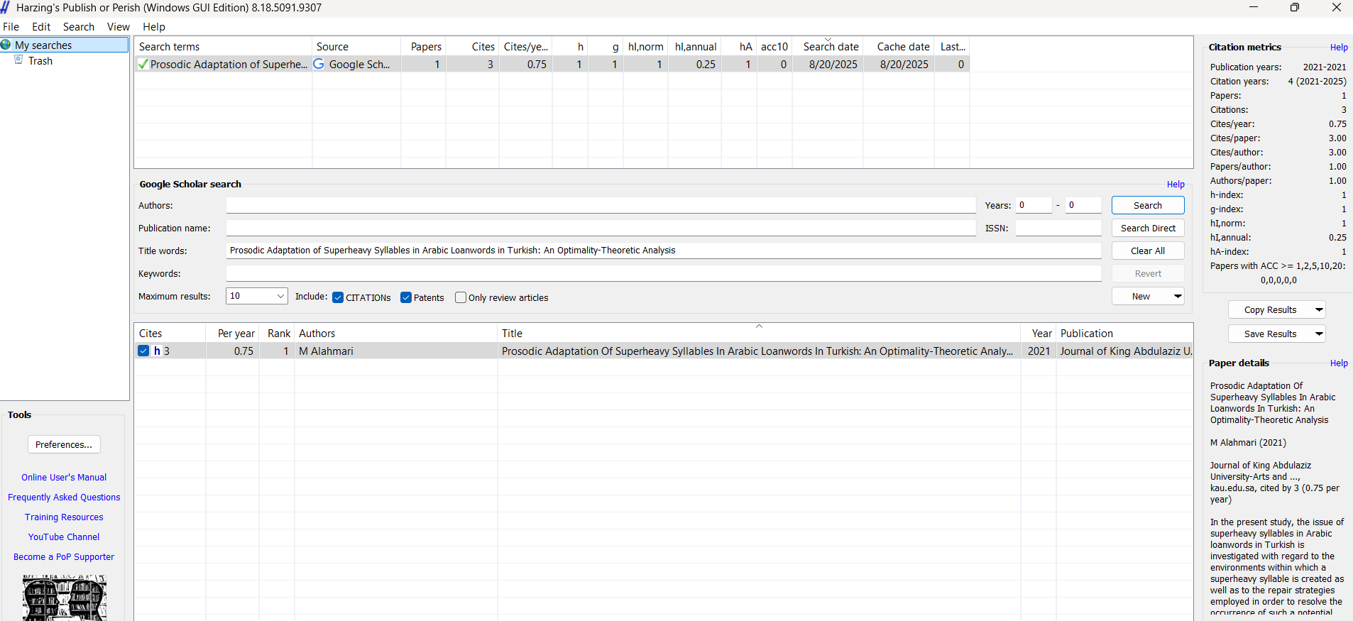 - Alahmari, M. (2021). Prosodic Adaptation of Superheavy Syllables in Arabic Loanwords in Turkish: An Optimality-Theoretic Analysis. Journal of Arts & Humanities, 28, 581-596. King Abdulaziz University, Saudi Arabia. https://prod.kau.edu.sa/centers/spc/jkau/Data2/Review_Artical_ar.aspx?No=4934. Click here for this paper's citation report (8/20/2025) - 2024-2025 academic year / 1446 Hijri. Please click here for a summary of the paper.