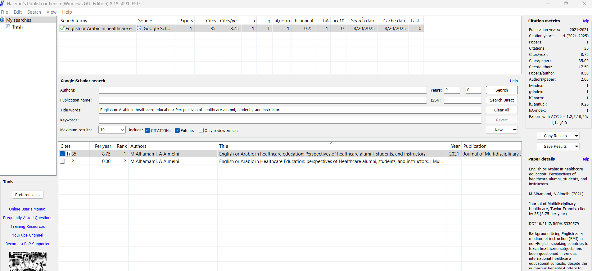 - Alhamami, M., & Almelhi, A. (2021). English or Arabic in healthcare education: Perspectives of healthcare alumni, students, and instructors. Journal of Multidisciplinary Healthcare, 14, 2537-2547. https://doi.org/10.2147/JMDH.S330579. Click here for this paper's citation report (8/20/2025) - 2024-2025 academic year / 1446 Hijri. Please click here for a summary of the paper.