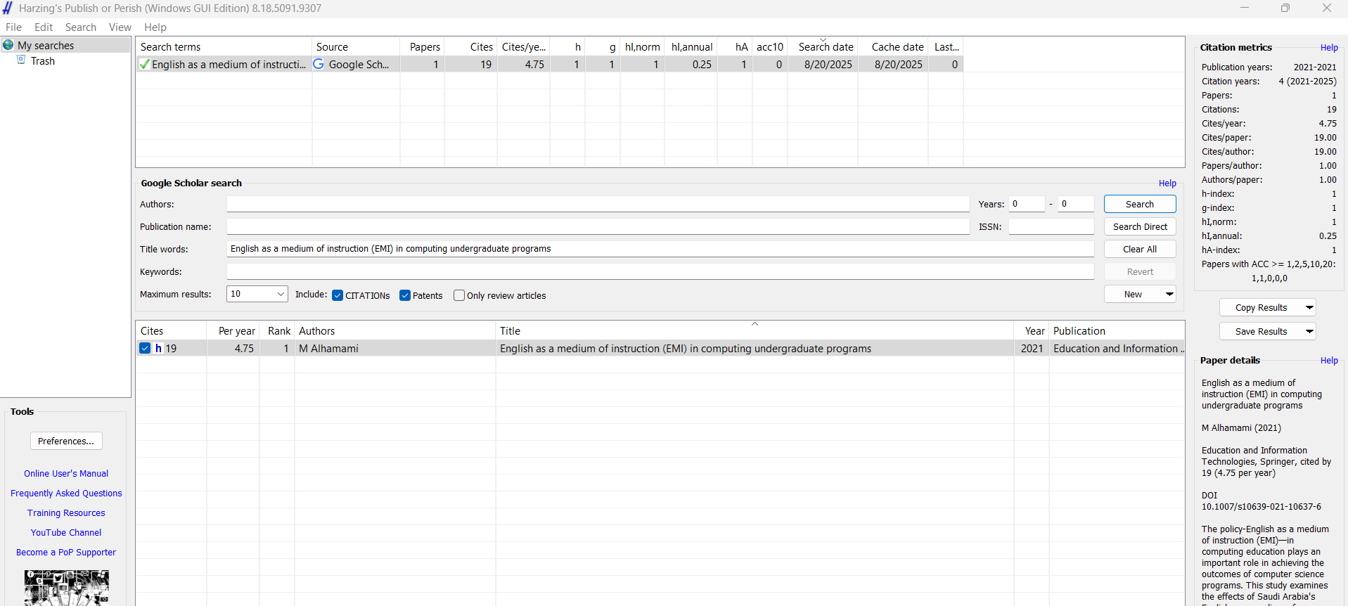 - Alhamami, M. (2021). English as a medium of instruction (EMI) in computing undergraduate programs. Education and Information Technologies, 26(5), 6549-6562. https://doi.org/10.1007/s10639-021-10637-6. Click here for this paper's citation report (8/20/2025) - 2024-2025 academic year / 1446 Hijri. Please click here for a summary of the paper.