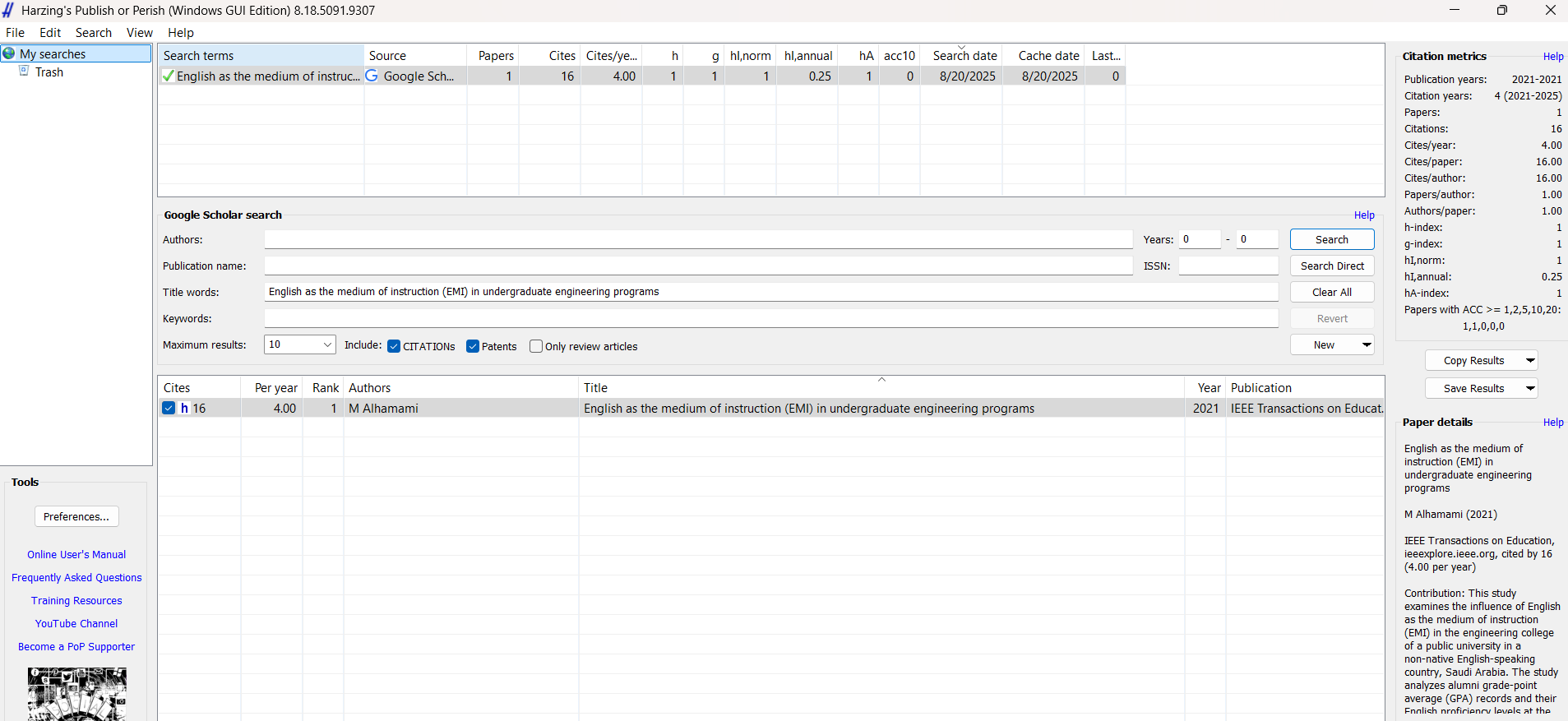 - Alhamami, M. (2021). English as the medium of instruction (EMI) in undergraduate engineering programs. IEEE Transactions on Education. https://doi.org/10.1109/TE.2021.3094210. Click here for this paper's citation report (8/20/2025) - 2024-2025 academic year / 1446 Hijri. Please click here for a summary of the paper.*